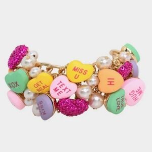 Whimsical statement featuring mixed colorful candy hearts, sparkly pavé fuchsia hearts, and pearls. The bracelet has an easy toggle closure. Made from metal and plastic.