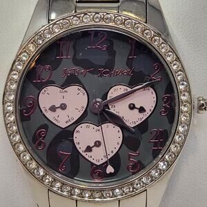 Betsey Johnson Three Hearts Crystal Love silver tone women's wristwatch watch, chunky large animal print face with pink heart multi dial functions, number markers, water resistant, quartz movement, crystal case material