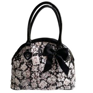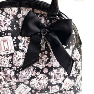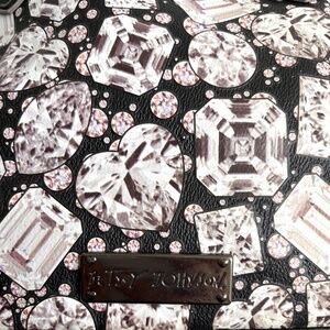 Great Betsey Johnson tote bag with a pattern of diamonds. A "crystal" hangs from a a smart satin-y black bow