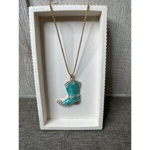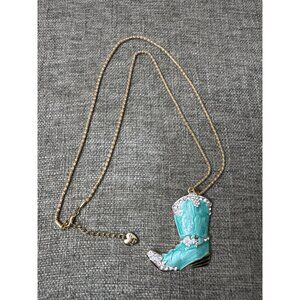 This Betsey Johnson necklace features a turquoise boot pendant adorned with sparkling rhinestones, adding a playful touch to any outfit.
