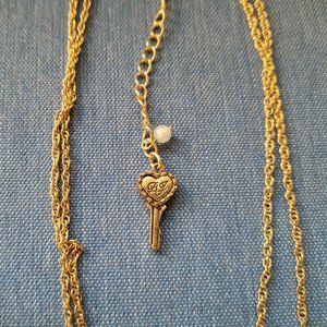 This is a Beautiful Double-Chain Necklace by Betsey Johnson. The Longer necklace holds the Beautiful Blue-Stone Bow that leads up to the area of Iridescent Stones before it goes into the Gold-tone Chain. There is a Gorgeous Faceted Marquis cut Blue Stone in the middle of the Bow. The Second Chain holds the Pretty Heart with a Clear Stone in the middle. The Iconic "BJ" Key with an opaque bauble next to it is present. Gunmetal-gray hardware and gold-tone hardware. Lobster clasp closure.