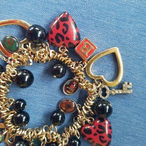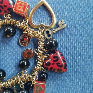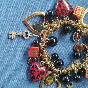 Gorgeous VINTAGE, RARE Charm Bracelet by Betsey Johnson. 3 Focal Charms are the Red & Black Lucite Heart Charms. Three Block Charms with "A"; "B"; "Betsey"; and "Johnson" on the sides. 3 Gold-tone open hearts. There are 3 Silver-tone Keys with Clear Stones (one key has one very tiny stone missing & another key has several Very Small clear stones missing -- they're so tiny I had to look through a magnifying glass to see if any were missing). There are 6 Oval Clear Lucite charms that have pictures behind the clear part - 2 spider charms; 1 floral charm; 1 skull & crossbones charm; 1 lips charm; 1 red & black charm. Many small and larger black Baubles on the Charm Bracelet. Charm Bracelet is loaded with Charms & looks Great on the Wrist. Gold-tone & silver-tone Hardware. Iconic "BJ" Gold-tone Heart Charm present. Slip-on, full-stretch Charm Bracelet.