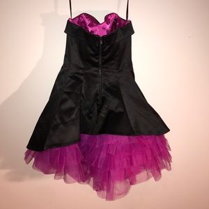 You will be sure to turn your head in This show stopper! Black satin with fuchsia ruffled tulle couture Betsy Johnson Couture evening dress.