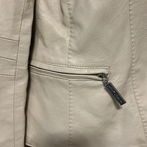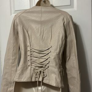 Betsey Johnson Vegan leather zip front Moto jacket in a soft whisper pink. Fully lined interior; ribbon details at zipper; functional front zip pockets; corset tie detail in back. Size small