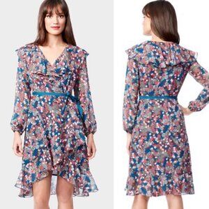 The Very Cherry Chiffon dress from Betsey Johnson is a delightfully feminine frock. Its elegant wrapped silhouette is trimmed with playful ruffles and tied with a teal ribbon at the waist. An allover abstract print adds a modern edge to this feminine style, while its chiffon surface lends a breezy touch.