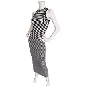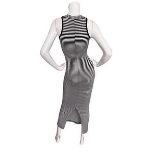 Black and white striped stretch jersey, sleeveless, high neckline, maxi length, rear slit, pullover style