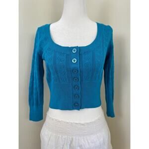 Betsey Johnson Vintage 90s y2k Button Cardigan S Blue Crochet Knit Sweater Crop