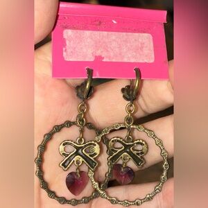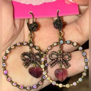 Betsey Johnson vintage hoops with bows and hearts in aurora borealis encircled crystal. New with tags.