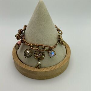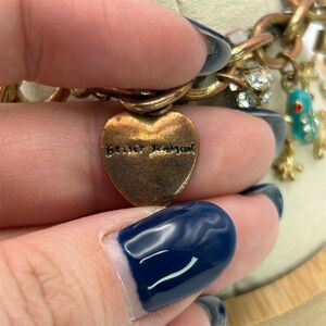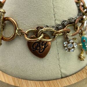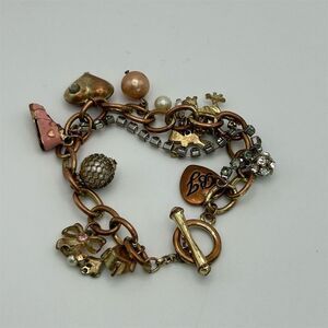 Keywords: Betsey Johnson bracelet, charm bracelet, gold bracelet, toggle closure, heart theme, shoe theme, frog theme, vintage jewelry, pre-owned bracelet, gold-tone metal, rhinestone bracelet, faux pearl bracelet, faux turquoise bracelet, 8-inch bracelet, fashion accessory.