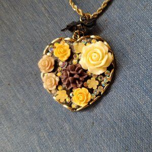 This is a Gorgeous Raised Floral Heart Pendant Necklace from Betsey Johnson's "Fabulous Flowers" collection The Flowers on the Heart are made from acrylic or a Bakelite-type of material. There are many Beautiful Iridescent Stones on the Heart. There is a Black Bow above the Heart. All Flowers and Stones present, intact, with no chips. The back has some scuffing (please see photos). The Iconic Betsey Johnson Heart by the clasp is present. Gold-tone hardware. Lobster-clasp closure.