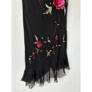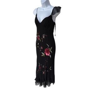 Betsy Johnson black label slip dress in good condition. There is a run and a couple small snags on the back of the left flutter sleeve - see photo - a slight unraveling of the hem in right front - see photo - and a couple small snags under left breast - see photos. I wasn't able to find any stains, rips, holes or any other significant blemishes. All the embroidery and sequins are intact. For its age, this dress is amazing! Dress consists of a semi-stretchy knit lining with a delicate sheer silk overlay. The style is pullover. It features adjustable spaghetti straps, a ruffled, asymmetric hem, spectacular 3-D sequined roses, and bright, colorful embroidery on both the front and back. This rare beauty is simply stunning. Please see photos for measurements. Length is app'x 51 inches long.
