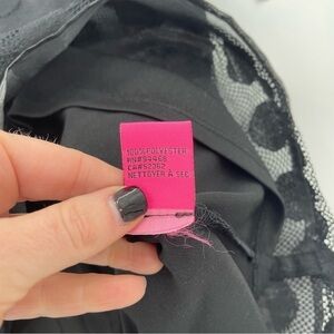 Betsey Johnson Whimsigoth Mod Flirty Sheer Neck 3/4 Sleeve Polka Dot Overlay Black Sheath. Fully lined. Sleeves and neckline are sheer with polka dots.