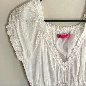 This Betsey Johnson white maxi dress in size Medium features a romantic Swiss dot texture, flutter sleeves, and a smocked waist for a flattering fit. The soft ruffles and tiered hem add feminine charm, perfect for garden parties, bridal events, maternity shoots, or beach vacations.