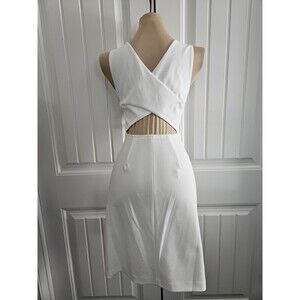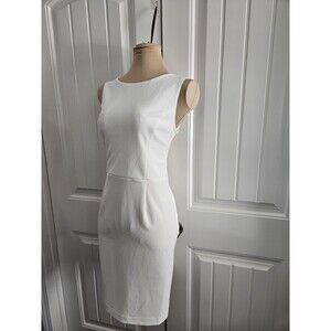 This is a vintage Betsey Johnson white sheath mini dress. The dress is marked a 10, but is closer to an 8. Measurements are in photos. It features a sleeveless style with a round neck, zip closure, and an open back design. Made of polyester and spandex blend fabric in crepe texture, this dress is lightweight and lined on the top. It is suitable for various occasions like travel, holy communion, parties, or business events.