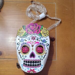 Unique skull design. Vibrant floral accents. Perfect for a bold statement. New with Tags. Made by Betsy Johnson. There is some yellowing of the glue around seams.