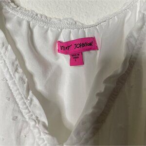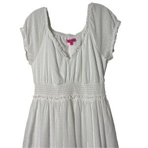 Tags: Betsey Johnson dress, white maxi dress, Swiss dot dress, ruffle sleeve dress, tiered skirt dress, cotton summer dress, women's maxi dress, smocked waist dress, romantic style dress, casual white dress, summer fashion, breathable cotton dress, Betsey Johnson clothing, nap dress, Bridal, Honeymoon, Bridal Shower, Flowy, Coquette, Girly, Fairy, Boho, Cottagecore, Milkmaid