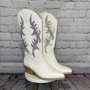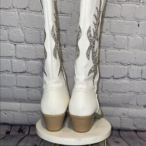 Elevate your style with Betsey Johnson's Aliza heeled boots, featuring a striking white and silver color palette with glass accents. These boots boast a classic western silhouette with a pointed toe and an elegant decorative stitching pattern. Perfect for making a statement, they combine sophistication with a touch of sparkle.