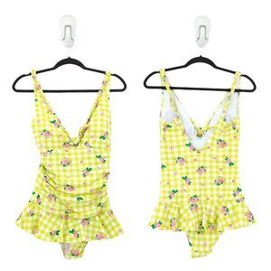 Betsey Johnson Women M Skirted Swimsuit Green White Gingham Plaid Floral 1 Piece