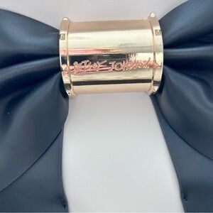 Black and white Betsy Johnson PU tote. Bright pink floral patterned lining. Black pouch included. Gold hardware. Snap closure. One zipped pocket, one detachable pouch, one slip pocket. Slight scratches on logo otherwise good condition.