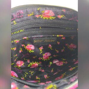 Features: Two handles, with removable strap, zipper closure, inside has pocket with zipper, inside also has two open pockets for phone etc