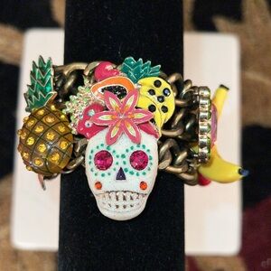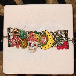 Betsey Johnson RIO Pink Sugar Skeleton Skulls Fruit Toggle Bracelet in great condition!!! No missing rhinestones. A few surface scratches on the heart that dangles. Very eye catching!!