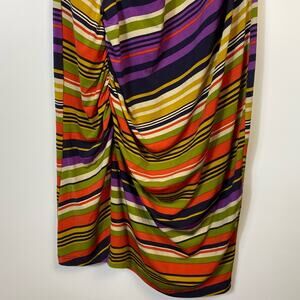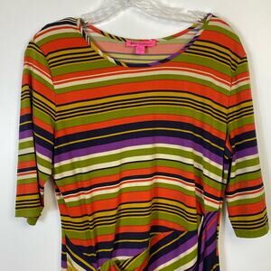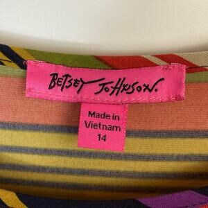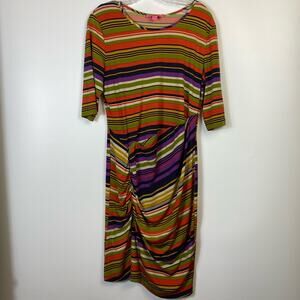 Betsey Johnson Womens striped dress in multi. Beautiful throwback autumn colors. Polyester blend helps prevent wrinkling. Lightweight with stretch. Ruching on front. Scoop neck. Size 14. Excellent used condition. No flaws detected. See measurements for fit.