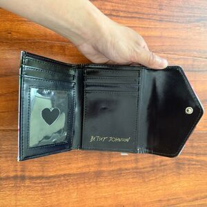 This Betsey Johnson Women's Wallet features a pink and grey floral design with a snap closure and logo accents. Made of polyurethane, this XS-sized wallet includes card holders, dividers, and is designed for folding. Perfect for women who love a cute, Y2K style with a touch of rose-themed accents, this wallet is a stylish accessory for any outfit.