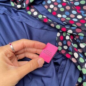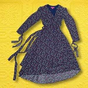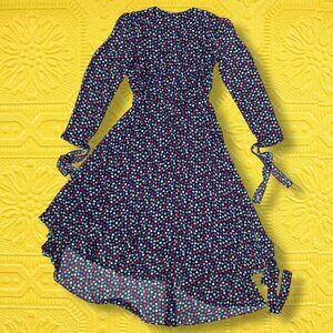 Description: hi low multicolor polkadot chiffon long sleeve wrap dress by Betsey Johnson in US women’s size 4.