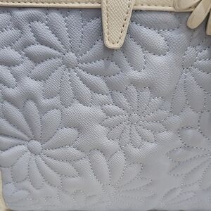 This elegant handbag features a beautiful cream and blue floral design, perfect for adding a touch of sophistication to any outfit. The intricate floral pattern and stylish accents make it a must-have accessory.