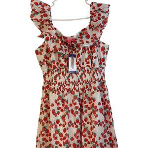 This Betsey Johnson dress features a charming strawberry print, perfect for warm weather. Made from breathable 100% cotton, it offers a comfortable fit, with ruffle detailing that adds a touch of elegance to its design. Ideal for those seeking a blend of style and comfort in their summer wardrobe.