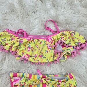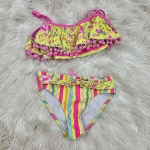 Betsey Johnson | Yellow Floral Stripe Ruffle Pom-Pom Bow BikiniGirls Size 10.
