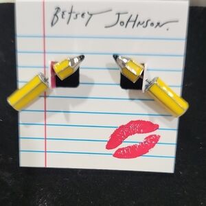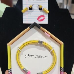 Charming Betsey Johnson set with pencil-themed bracelet and earrings. Bright yellow with playful design.