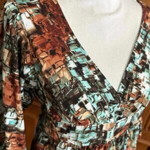 Betsey Johnson bell sleeve top blouse shirt, deep V neckline crossover faux wrap style front with thick fabric tie back cinch-able empire waist, pleated fit & flare bodice has a full flouncy hemline and gorgeous butterfly ruffled bell sleeves, abstract paint stroke multicolored print, women’s size S small, in excellent like new condition.