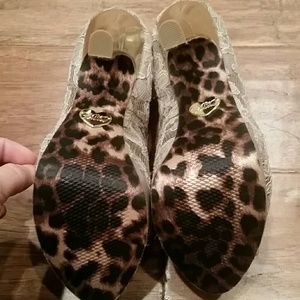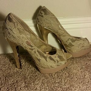 Light tan lace and gold heel. Never worn but there are some scuffs just from being tossed around in my closet.