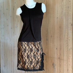 Vintage 90's classy sexy lingerie look skirt with delicate black lace with over a satiny beige slip layer. The flirty slit outlined in lace with a bow at the top completes the naughty but nice date night styling. And it’s so versatile because paired with the right classic black top it would make a perfect dressy professional outfit for a work dinner with clients or a cocktail party or gallery opening.