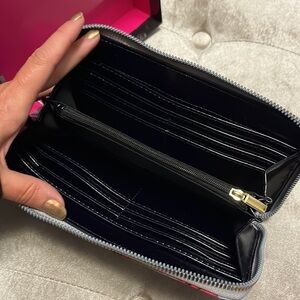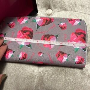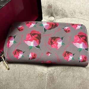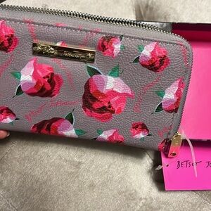 Brand new with original tags and in gift box, this is a Betsey Johnson standard size wallet that features a zipper compartment for your change and many card slots as well as slots for your bills. This is made of polyurethane and is a gray with bright pink flowers and Betsey Johnson logo. Gold hardware, full zipper closure. This would make a great gift for someone or for yourself.