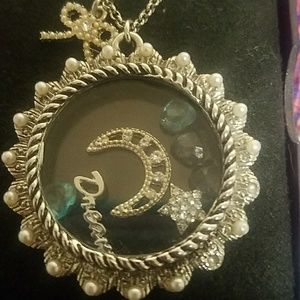 Betsey Johnson necklace, glass pendant containing charms that shake. Circular pendant is surrounded by silver designs and very tiny pearls, 2 of which are missing - not noticeable unless looking up close but 2 are missing, there's just a silver circle in the spot. There is a second small pendant, a bow encrusted with tiny pearls and a rhinestone in the center, it's gorgeous. Chain is 16 to 18 inches with a lobster clasp and the tiny BJ logo heart. A few very small scratches on the glass.