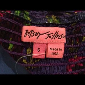 Betsey Johnson strapless dress with optional clip on adjustable halter strap. 100% silk, lining is 100% polyester, elastic in the upper back. *Zipper is not working perfectly.* but definitely an easy fix. Looks super cute with a belt! Only wore it once!