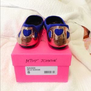 Beautiful pair of Betsey Johnson blue suede flats. Never worn! Brand new! The have gold toe & back detail with hearts. Really pretty! Leopard print at the bottom & inside.