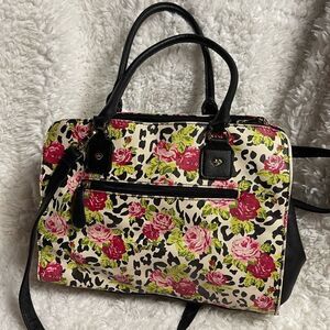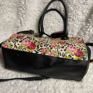 Betsey Johnson floral red roses & cheetah print shoulder bag black trim & straps