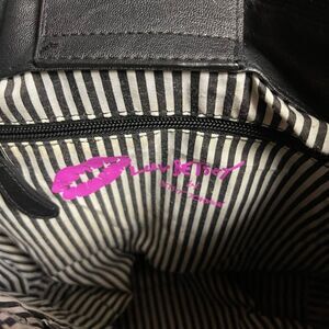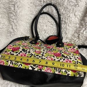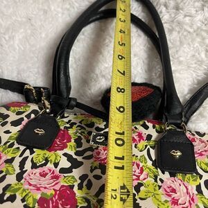 Betsey Johnson floral red roses & cheetah print shoulder bag black trim & straps. Black and red heart Pompom accent..back zipper. Top snap closure the inside lining has a side zipper two side pockets. Pre owned in good used condition small stains on the lining see all pictures any questions please message.pb