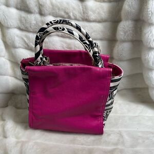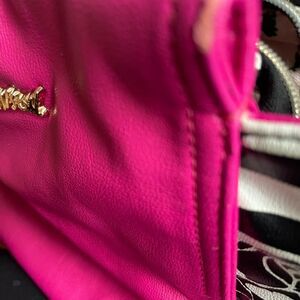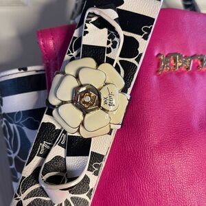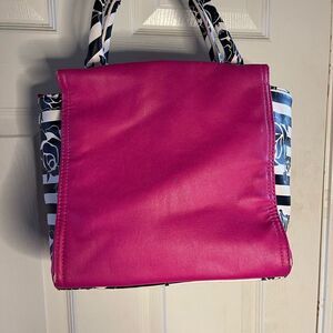 Betsey Johnson hot Pink ,black &white stripes and roses Satchel with bow and brooch accents top zipper front and back pockets the inside lining has a side zipper two side pockets pre owned in good used condition the bag is missing the detachable shoulder strap sign of wears on the bottom corners of the bag see all pictures any questions please message.