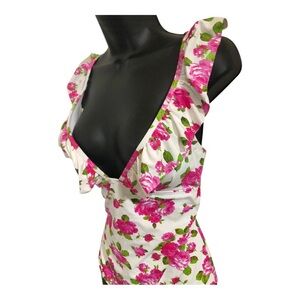 Betsey Johnson white and pink roses love always Betsey print floral flutter strap plunge front one piece swimsuit size medium new