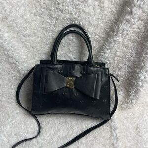 Betsey Johnson medium Satchel Black embossed hearts with large bow accent back compartment top zipper the inside lining has a side zipper two side pockets.pre owned in good used condition see all pictures any questions please message.