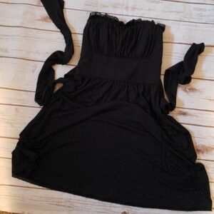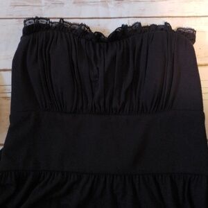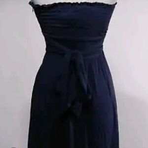 This charming navy blue strapless dress features a lace edged pleated bust with an elastic back panel. It also comes with removable straps. The banded waist leads to a simple a-line pleated skirt, also edged in lace. As an added fun touch the waist ties for a big Betsey bow.
