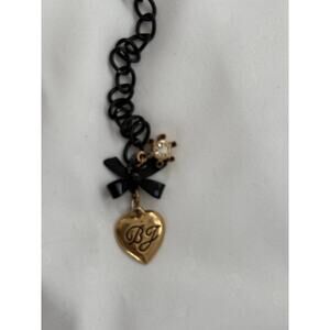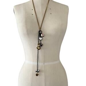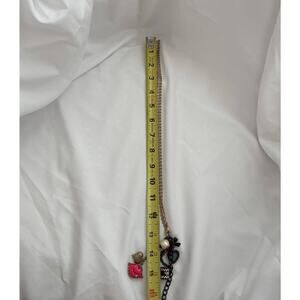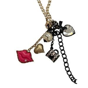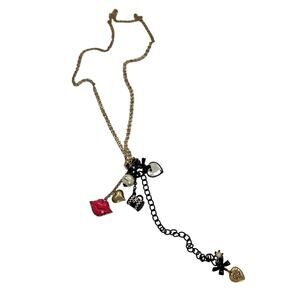 Long length (see photos for measurements and drop) gold and black chain link necklace with charms: lips, hearts, coffee mug, faux pearl with Betsy Johnson logo. Black, hot pink, pink accents, rhinestones. Lobster claw at bottom of drop. Excellent preloved condition with no observed signs of wear. lease zoom photos for item details. All listings are cleaned and packaged for shipping after photos.