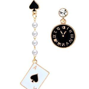 ♠️ Betsey Johnson stunning mismatched dangle earrings. Unique with a vintage flair. Small faux pearl accents with pretty details of a clock & the ace of spades ♠️ post backs hypoallergenic & nickel free ♠️