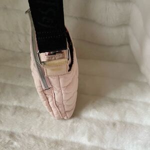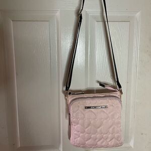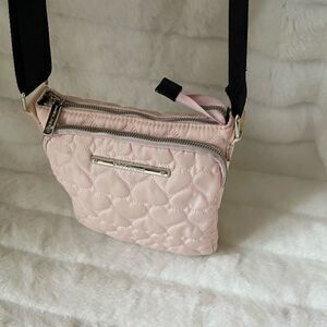 Betsey Johnson pink quilted heart fabric with black nylon crossbody strap