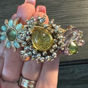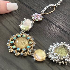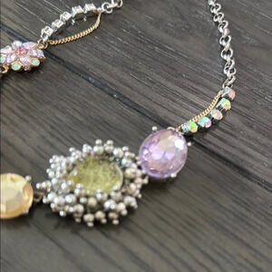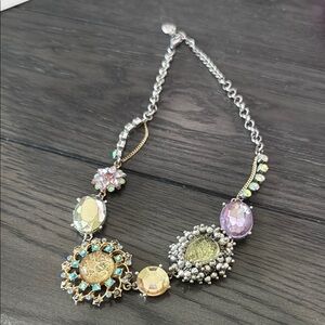 This stunning Betsey Johnson necklace & bracelet combo features a captivating blend of gold and silver tones, highlighted by ornate floral designs with pastel stones. The intricate detailing and vintage-inspired elements make it a standout piece in any jewelry collection.