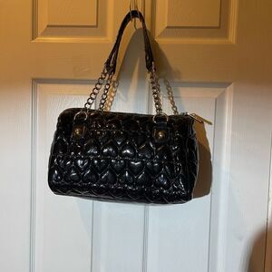 Betsey Johnson synthetic Black patent Quilted hearts Boston style shoulder bag gold tone chain accent and hardwares..Top zipper the inside lining has a side zipper two side pockets.See all pictures any questions please message.